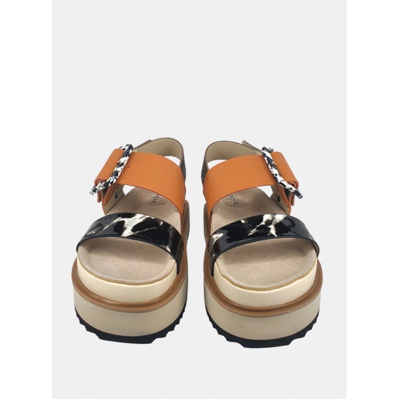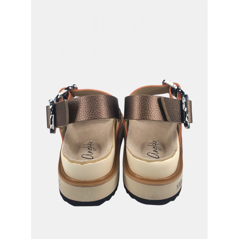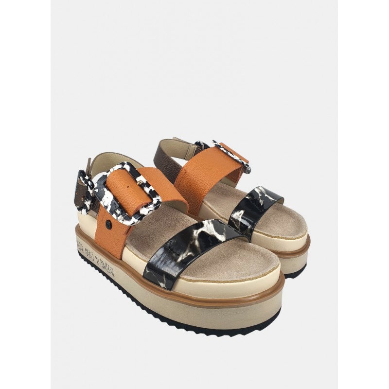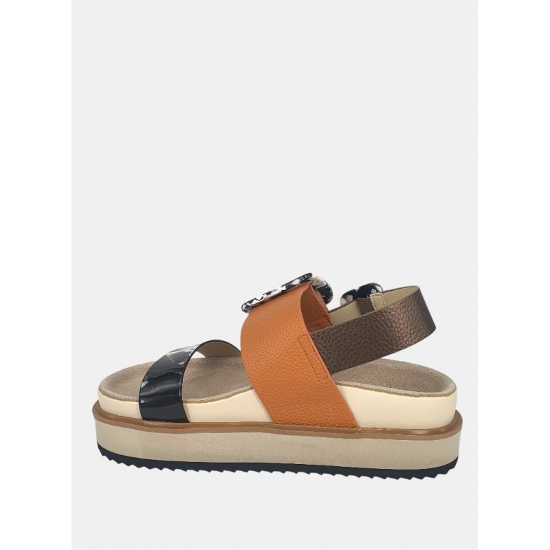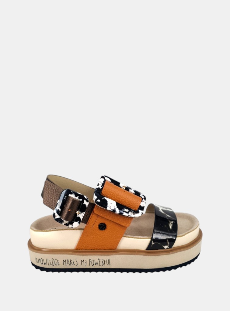 Sandalia para mujer de diseño de dos tiras con hebilla, cierre ajustable al tobillo con hebilla y detalle de texto de mensaje de la marca en la plataforma.