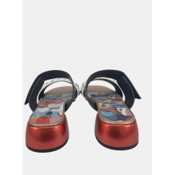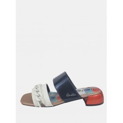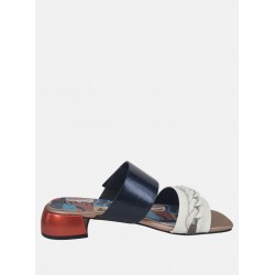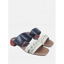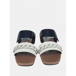 Sandalia combinada para mujer de diseño de doble tira ancha una de ellas con cadena a contraste, plantilla de diseño estampado de la marca y tacón en color a contraste de paro. 4 cm.