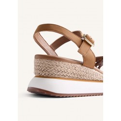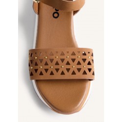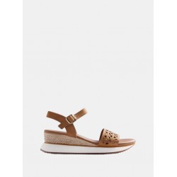 Sandalias para mujer de diseño de tira gruesa troquelada en el empeine, cierre ajustable con hebilla al tobillo, plantilla acolchada, cuña forrada estilo rafia y una altura cuña de 5 cm.