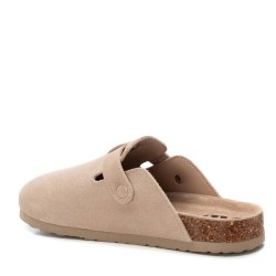 Zueco clásico para mujer fabricado en serraje de puntera cerrada y correa ajustable mediante hebilla metálica lateral, entresuela de corcho y una altura aprox de 3 cm.