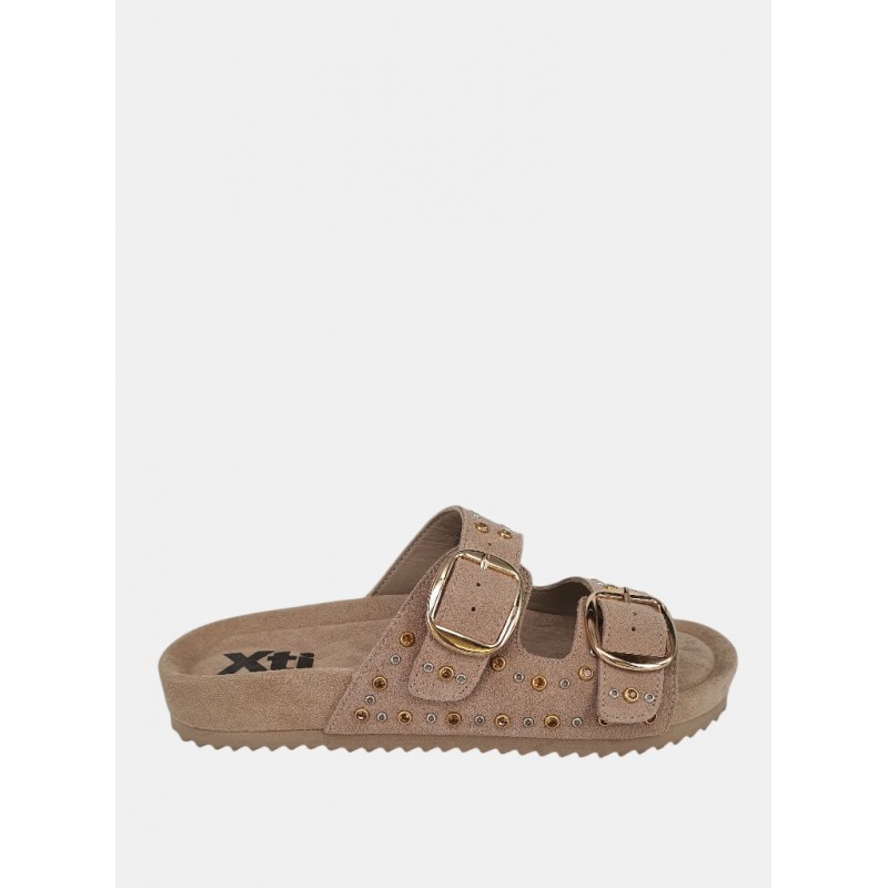 Sandalia para mujer de doble pala con hebilla decorativa y sutiles tachas brillantes más suela bio que aporta un extra de confort y además es antideslizante y muy flexible.