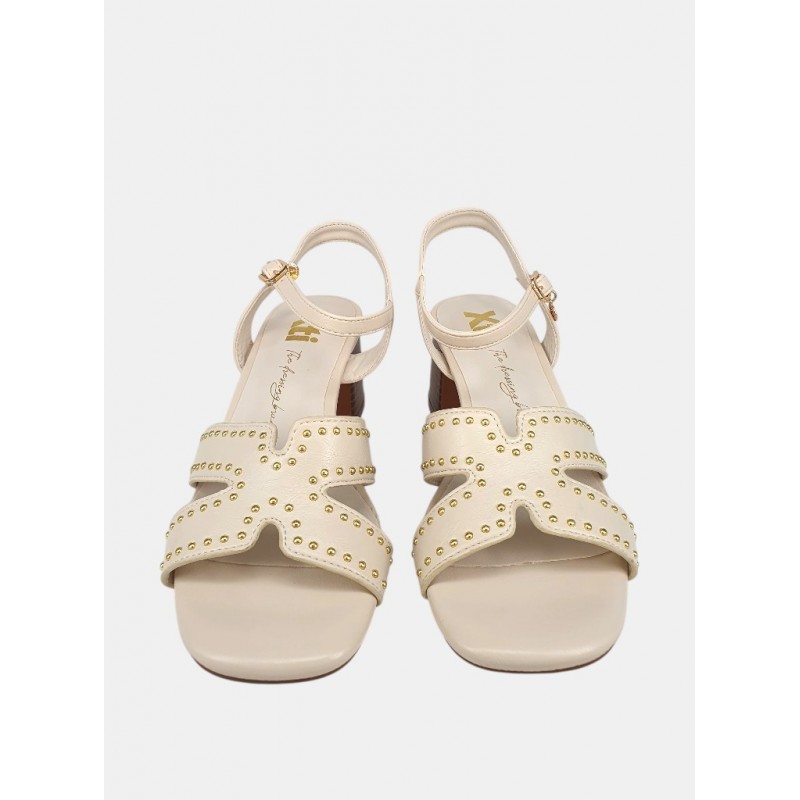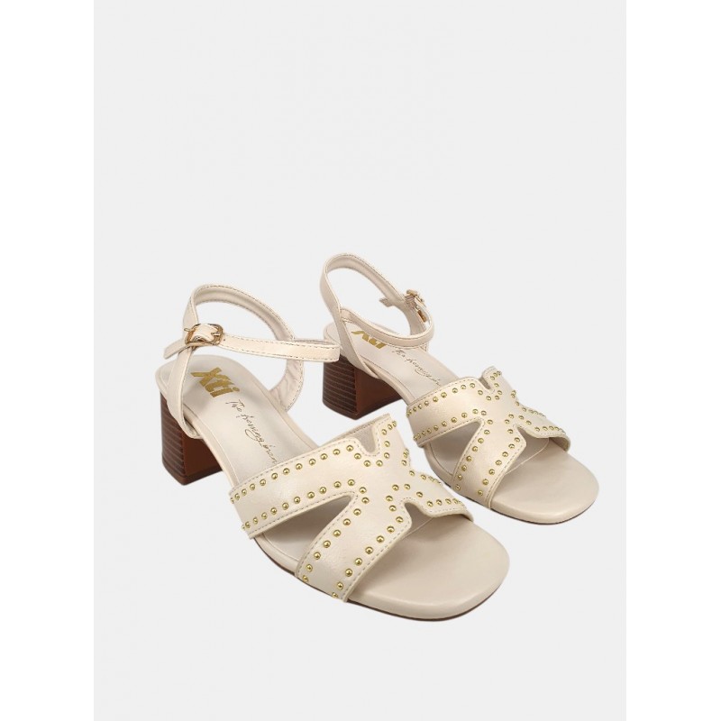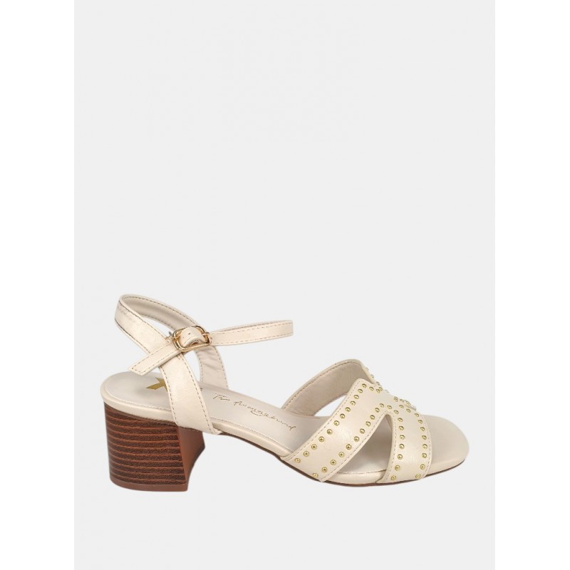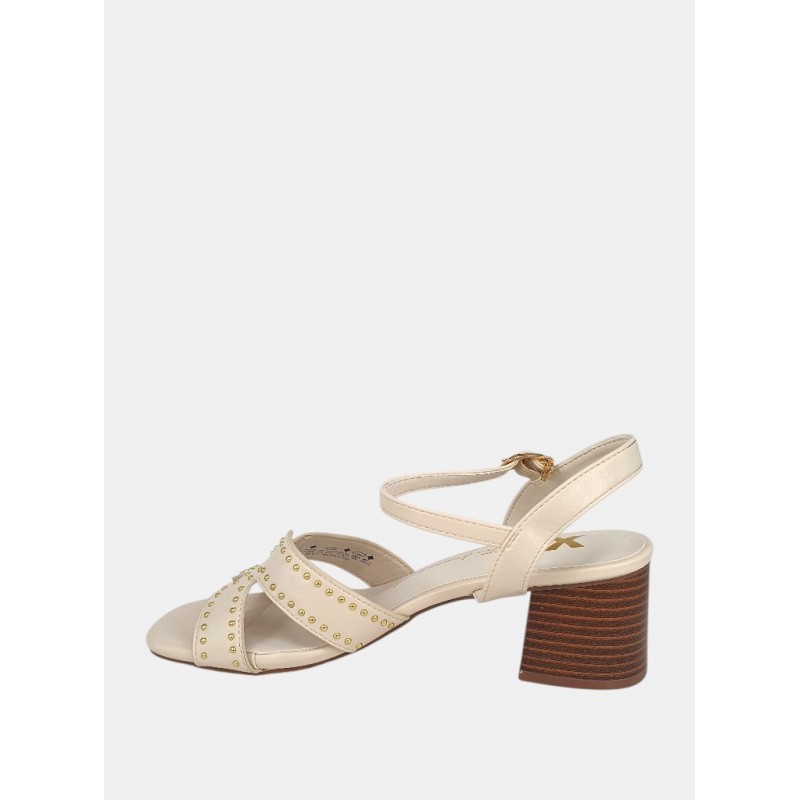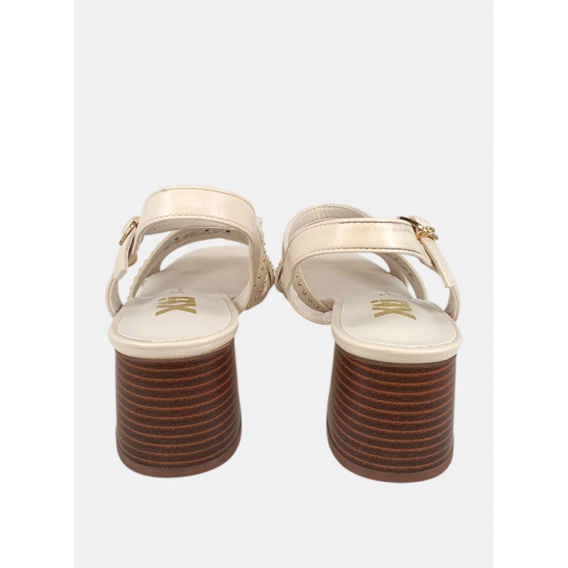 Sandalia para mujer de diseño de pala con tachuelas, cierre al tobillo con hebilla y tacón bloque de una altura de aprox. 6 cm.