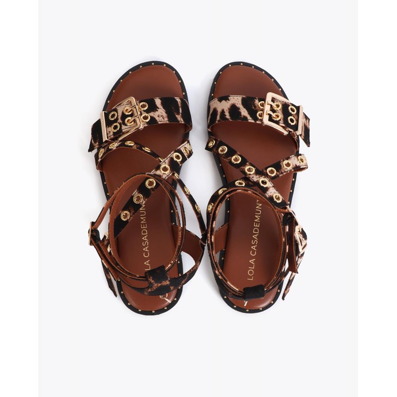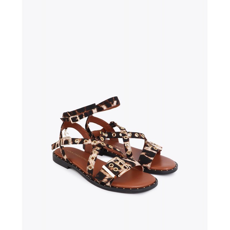 Sandalia plana elegante con tiras cruzadas, estampado de animal print y hebillas doradas personalizadas. Plantilla acolchada para comodidad diaria. Ideal para combinar con estilos veraniegos.