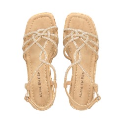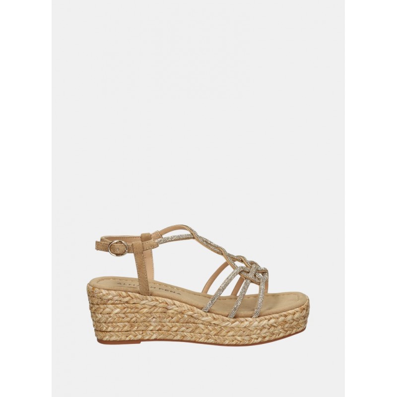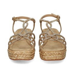 Sandalia de cuña para mujer de diseño de tiras entrelazadas en la parte del empeine de strass hasta el tobillo, cierre de hebilla al tobillo, acabado punta cuadrada y cuña de yute de una altura aprox. de 9 cm.