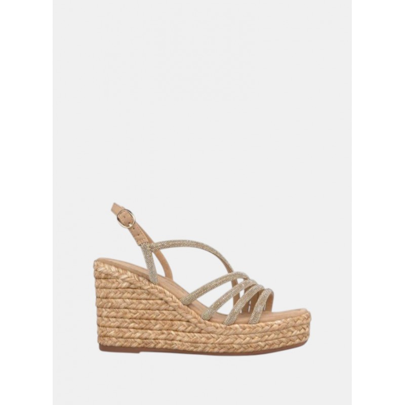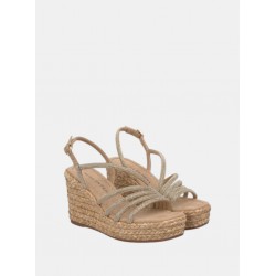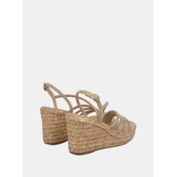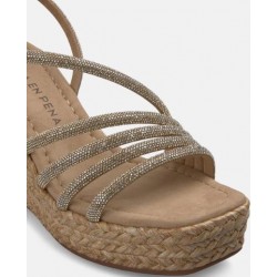 Sandalia de cuña para mujer de diseño de tiras en la parte del empeine de strass con cierre de hebilla al tobillo, acabado punta cuadrada y cuña de yute de una altura aprox. de 9 cm.