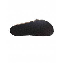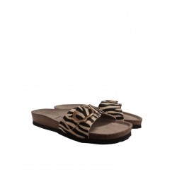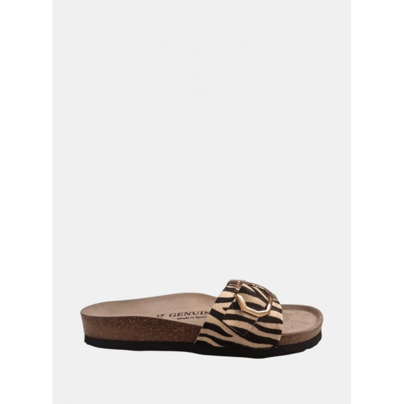 Sandalia pala para mujer de estampado animal print y hebilla para mejor ajuste, plantilla anatómica de planta de corcho y foam más suela de EVA a contraste.