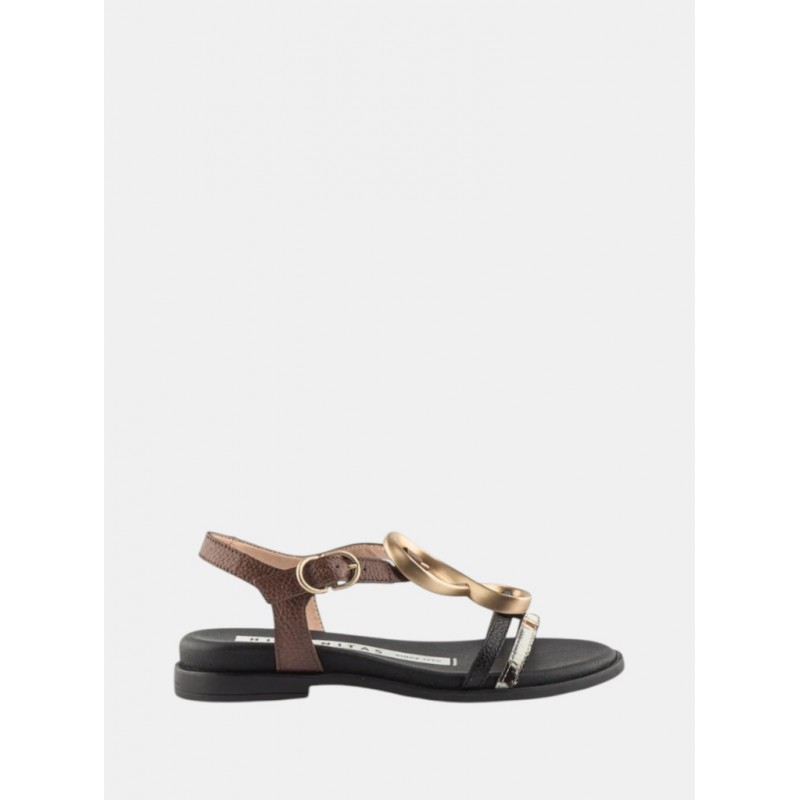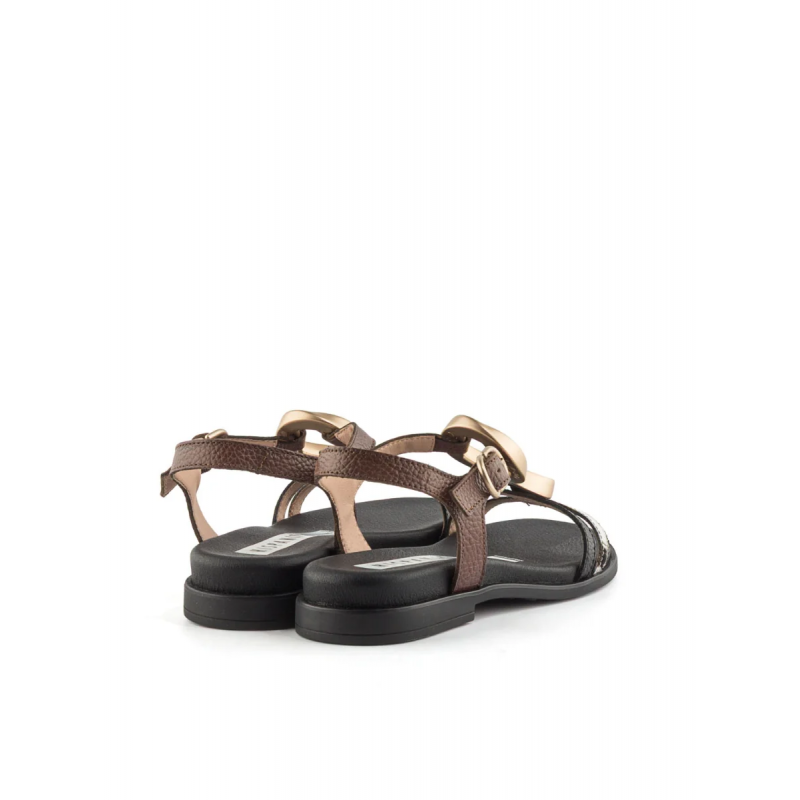 Sandalia en piel para mujer de diseño adorno de infinito, tira estampada, cierre de hebilla al tobillo, plantilla semibio que amortigua muy bien la pisada, forro interior de origen no animal 100% transpirable y termorregulador, cuanta ecnología Triflow de triple almohadillado en la zona de la pisada que absorbe los impactos y aporta un efecto acolchado al caminar, piso de TR con perfil de tacos y una altura de 2,5 cm.