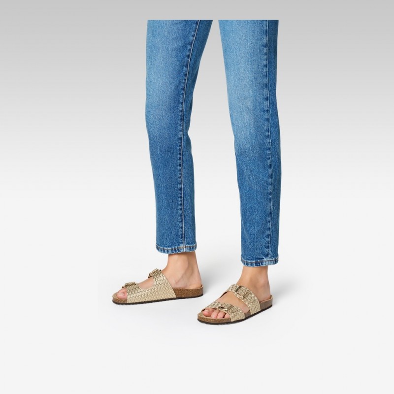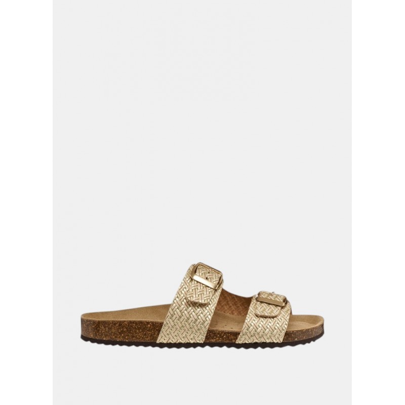Sandalia abierta de mujer con doble correa, de estilo contemporáneo y desenfadado. Confeccionada en piel estampada con suela anatómica, aquí se presenta en color dorado claro. Ligera y a la moda, Brionia R hace brillar los looks informales de la temporada estival.