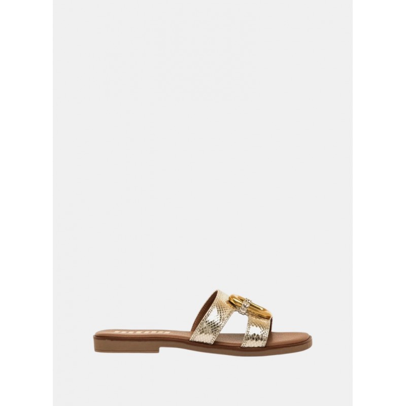 Sandalia plana para mujer de diseño de tira de acabado efecto piel y una pieza central metálica ovalada que destaca, plantillas con tecnología comfort mejoran la comodidad en cada paso y una altura aprox. de 4 cm. Ideal para añadir un toque diferente a looks veraniegos.