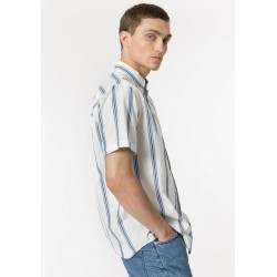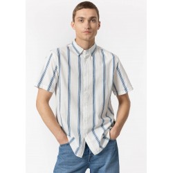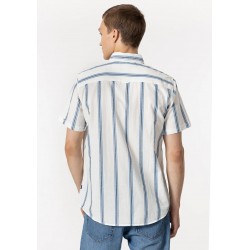 Camisa de rayas con cuello solapa y manga corta. Cierre frontal con botones.