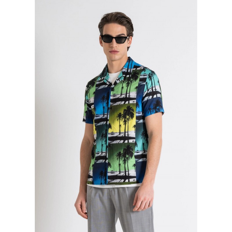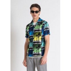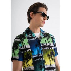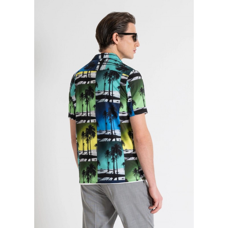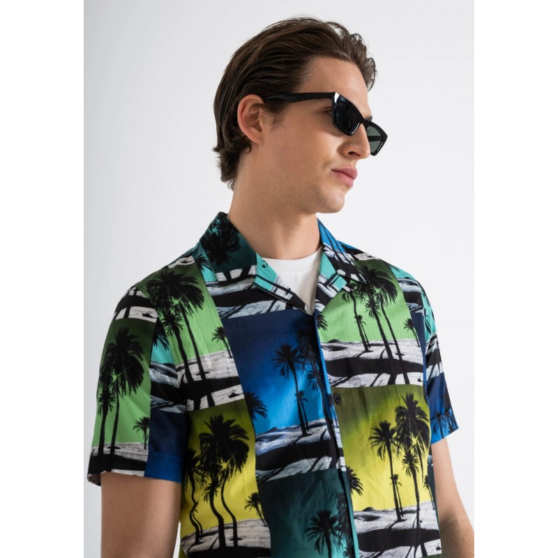 Camisa de manga corta en tejido de algodón suave y mezcla viscosa, enriquecido con un patrón tropical moderno. El ajuste ancho y confortable, garantizado por el abotonamiento central y el cuello camisero, perfecto para la temporada de verano.