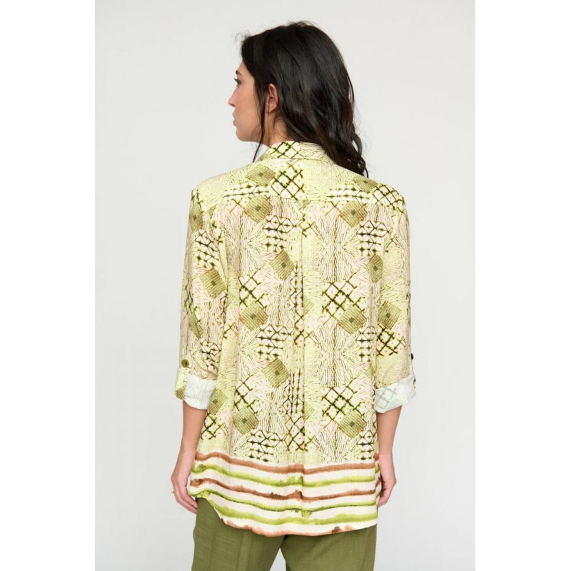 Camisa fluida con estampación étnica. Cuello camisero. Corte recto. Cierre frontal con botones nacarados. Manga larga acabada en puño con cierre de un botón. Cinta y botón para recoger la manga. Canesú doble con pliegue en la espalda. Bajo ligeramente redondeado.