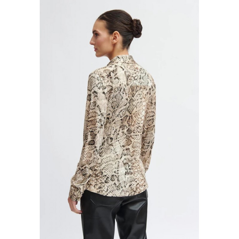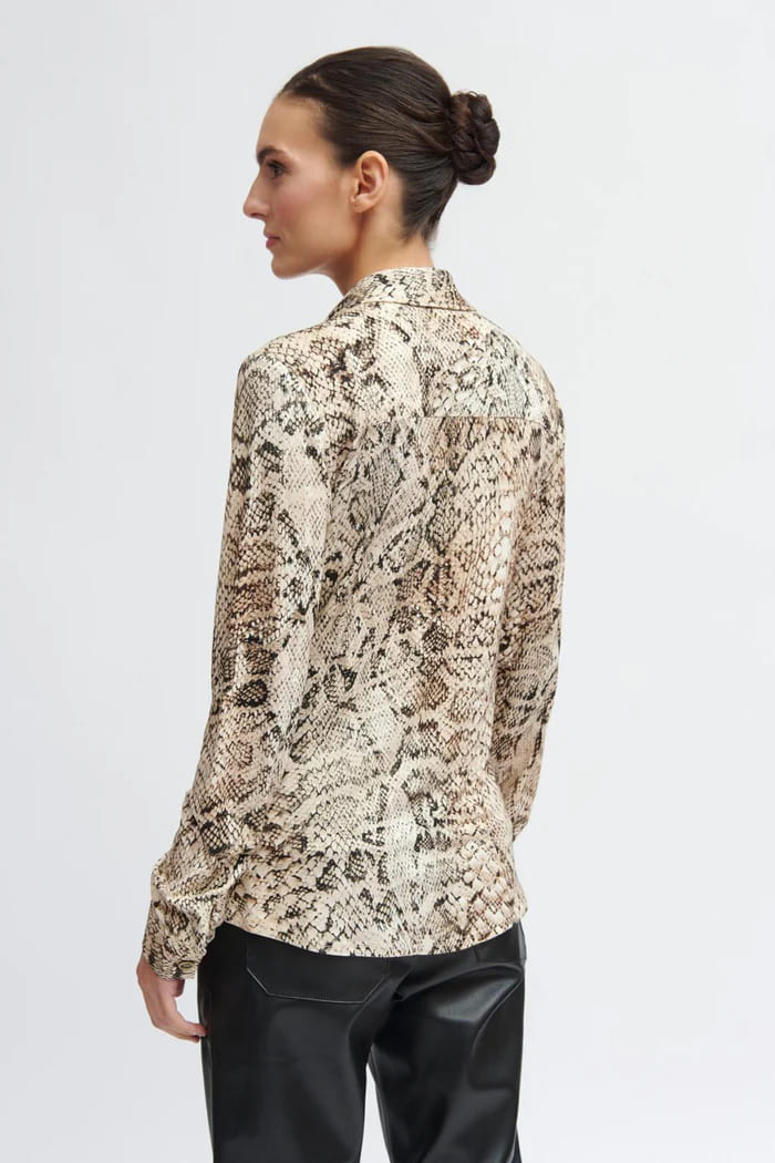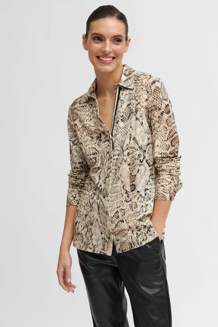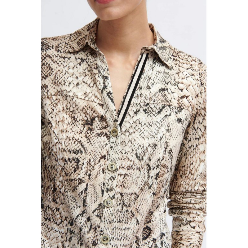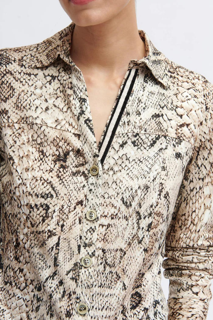 Camisa animal print para mujer.Cuello camisero abierto con escote en V y detalle de cinta bicolor. Cierre frontal con botones. Manga larga acabada en puño con cierre de un botón. Canesú trasero. Bajo recto.