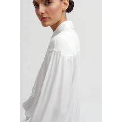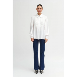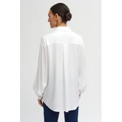 Camisa lisa fluida para mujer.Bordada. Diseño oversize. Cuello camisero. Cierre frontal con botones ocultos en tapeta. Bordado frontal. Manga larga abullonada acabada en puño sencillo con cierre de un botón joya. Bajo redondeado y más largo por detrás.