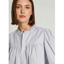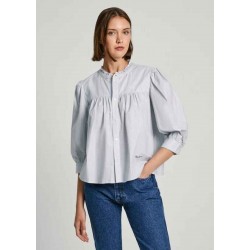Camisa en tejido popelín de algodón para mujer. Cuello redondo con mini volantes.  Manga larga abullonada. Cierre frontal abotonado.  Canesú con detalles fruncidos. Logo PEPEJEANS en cursiva bordado en bajo.