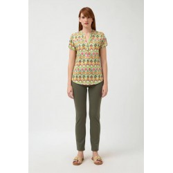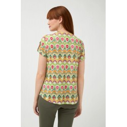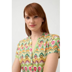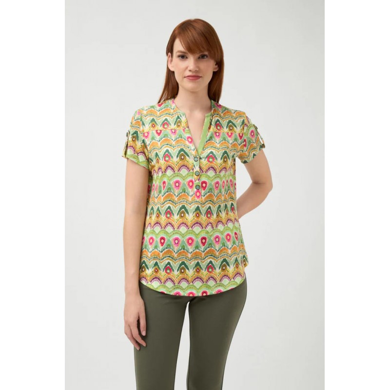 Camisa para mujer de punto con estampado étnico, cuello redondo y escote con ligera abertura en V, cierre frontal con botones y manga corta.