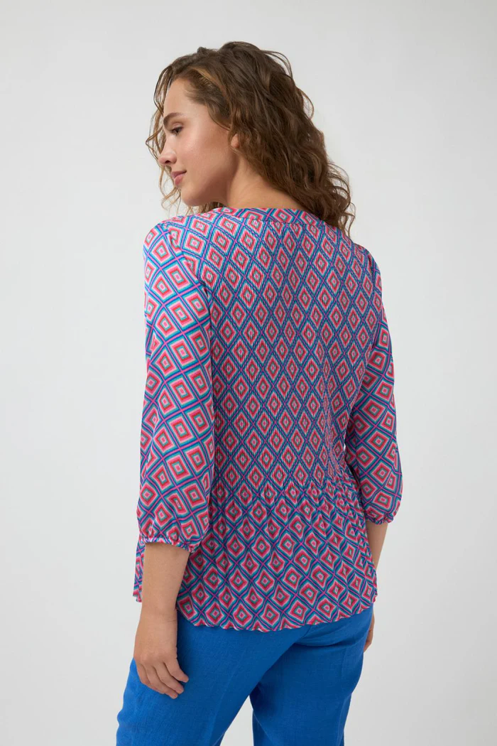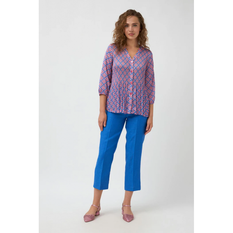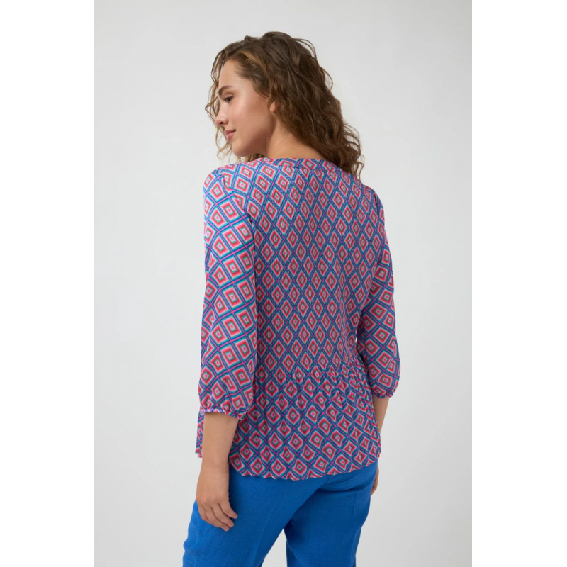 Camisa plisada con estampado geométrico para mujer. Tejido fluido. Cuello redondo con escote en pico. Cierre frontal con botones efecto nácar. Manga larga acabada en puño elástico. Bajo recto con volumen por el plisado.
