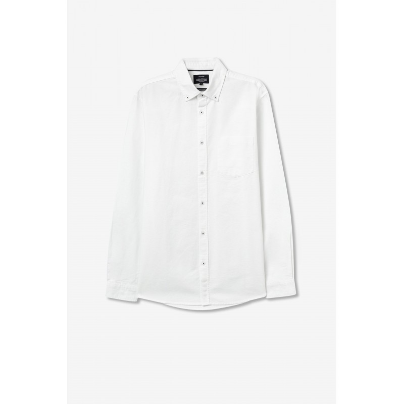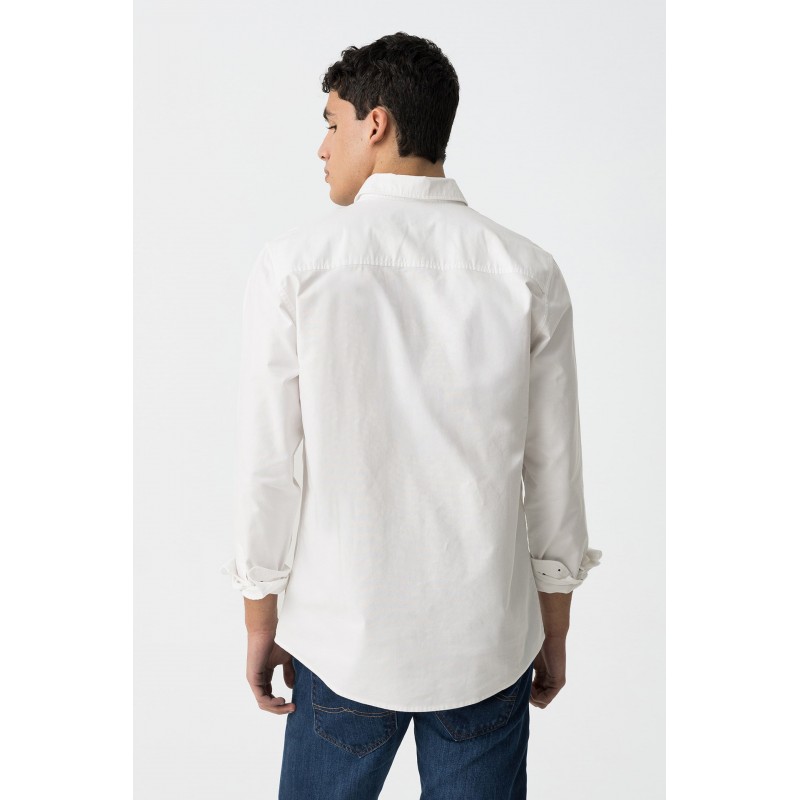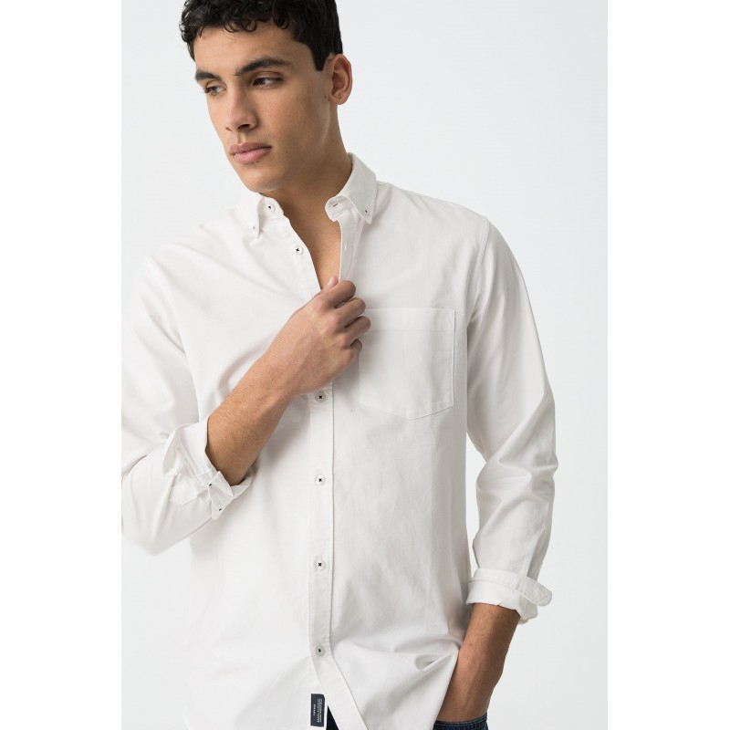 Camisa slim fit para hombre de solapa con botones, cierre frontal de botones, bolsillos delantero, detalles de la marca y manga larga.