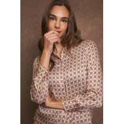 Camisa estampada para mujer. Cuello camisero. Cierre frontal con botones. Diseño recto. Manga larga acabada en puño con botón. Bajo ligeramente redondeado.