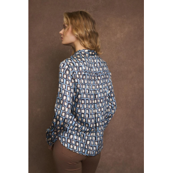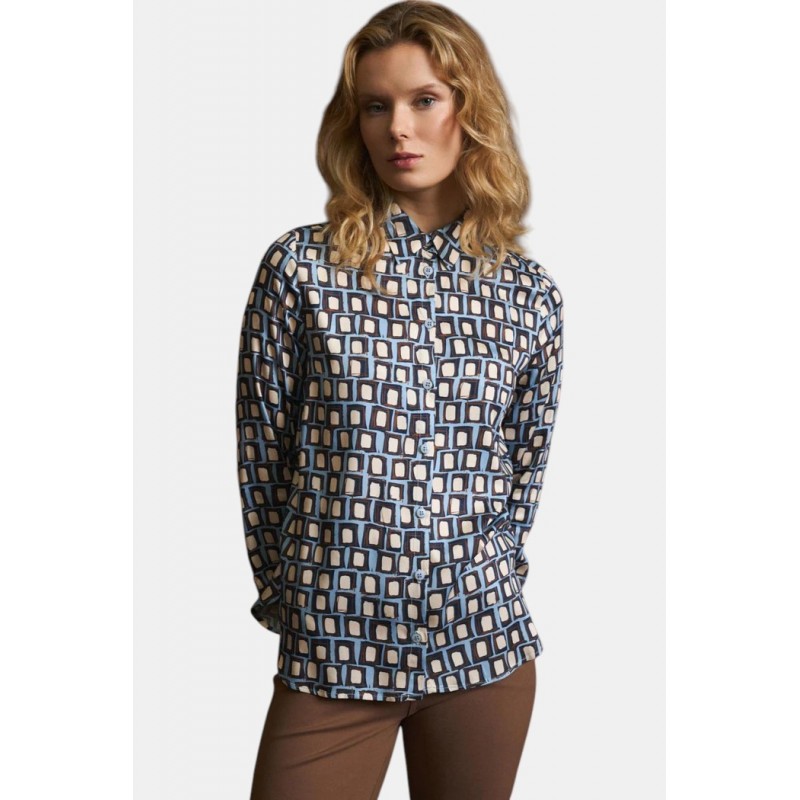Camisa fluida para mujer. Con estampado geométrico. Cuello camisero. Cierre frontal con botones. Diseño recto y ancho. Manga larga acabada en puño con cierre de botón. Bajo ligeramente redondeado.