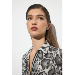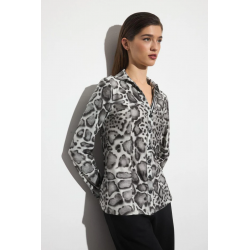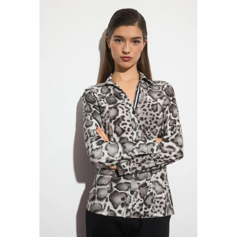 Camisa estampada para mujer. En tejido suave de punto elástico. Cuello camisero abierto con escote en V y detalle de cinta bicolor. Cierre frontal con botones. Manga larga acabada en puño con cierre de un botón. Canesú trasero. Bajo recto.