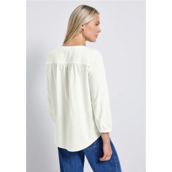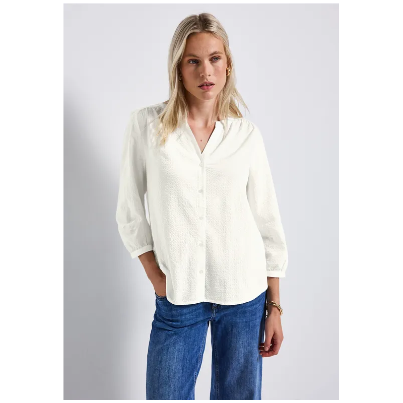 Camisa basica para mujer. El cuello redondo con abertura y tapeta de botones y las mangas 3/4 con botones crean un look relajado y moderno. El tejido texturizado de seersucker es agradablemente vaporoso.
