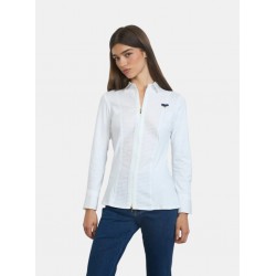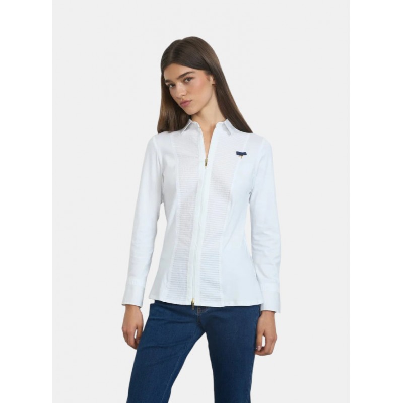 Camisa para mujer de cuello camisa, cierre frontal de cremallera doble, lazo con broche ornamental, detalle de panel de puños y parte delantera acanalada y mangas largas.