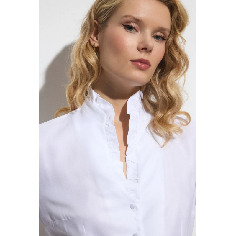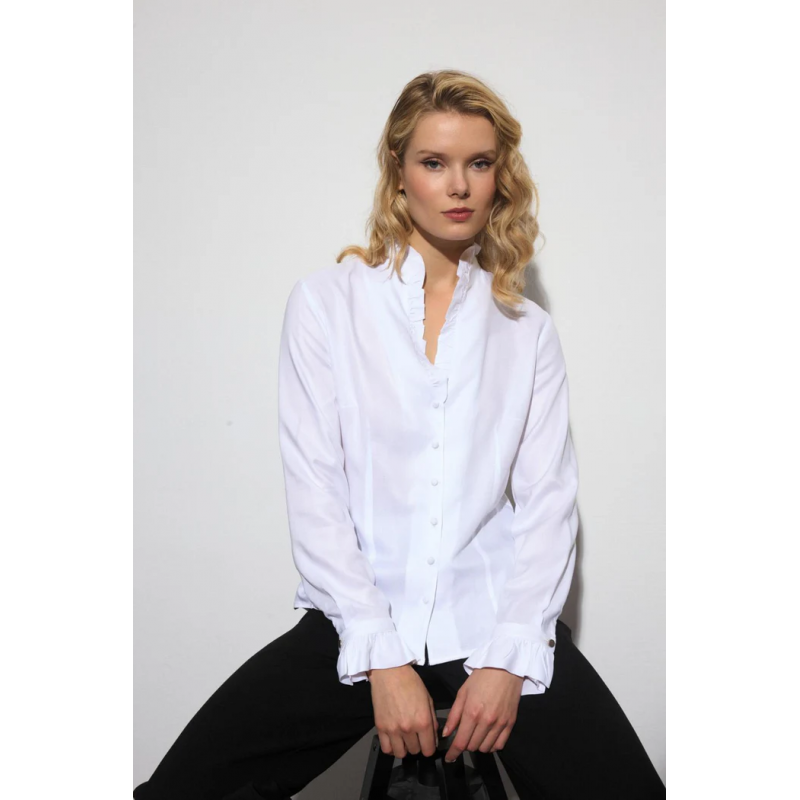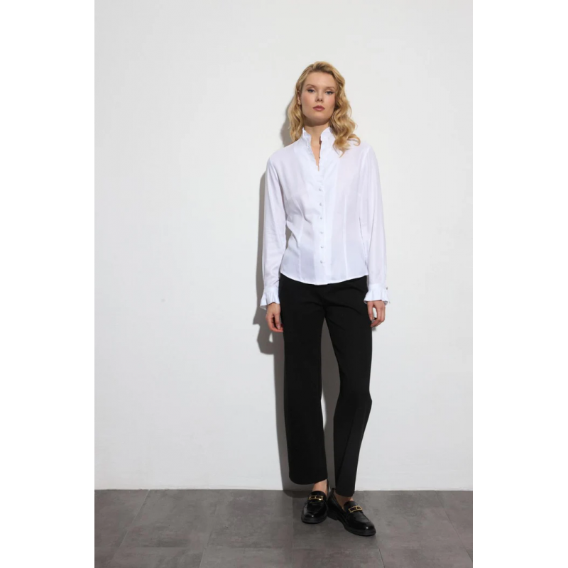 Camisa de volantes para mujer  de cuello mao con escote pico y detalle de volante. Cierre frontal con botones forrados y detalle de volante. Diseño entallado en mezcla de tejidos; parte frontal en algodón liso combinado con espalda y mangas en tejido de punto elástico para mayor confort y adaptabilidad de la prenda. Manga larga acabada en puño con cierre de botón y detalle de volante. Bajo ligeramente redondeado.