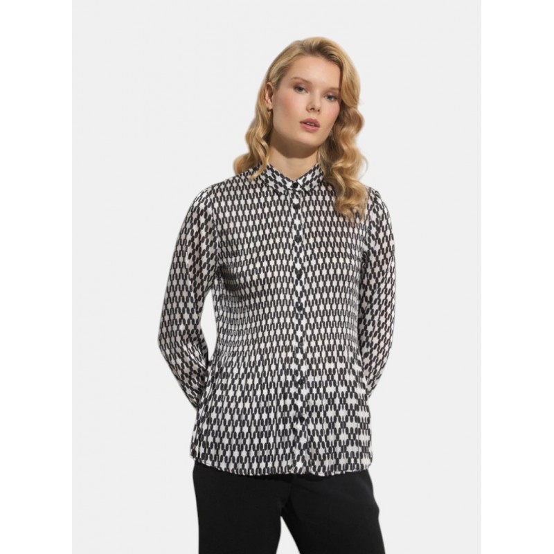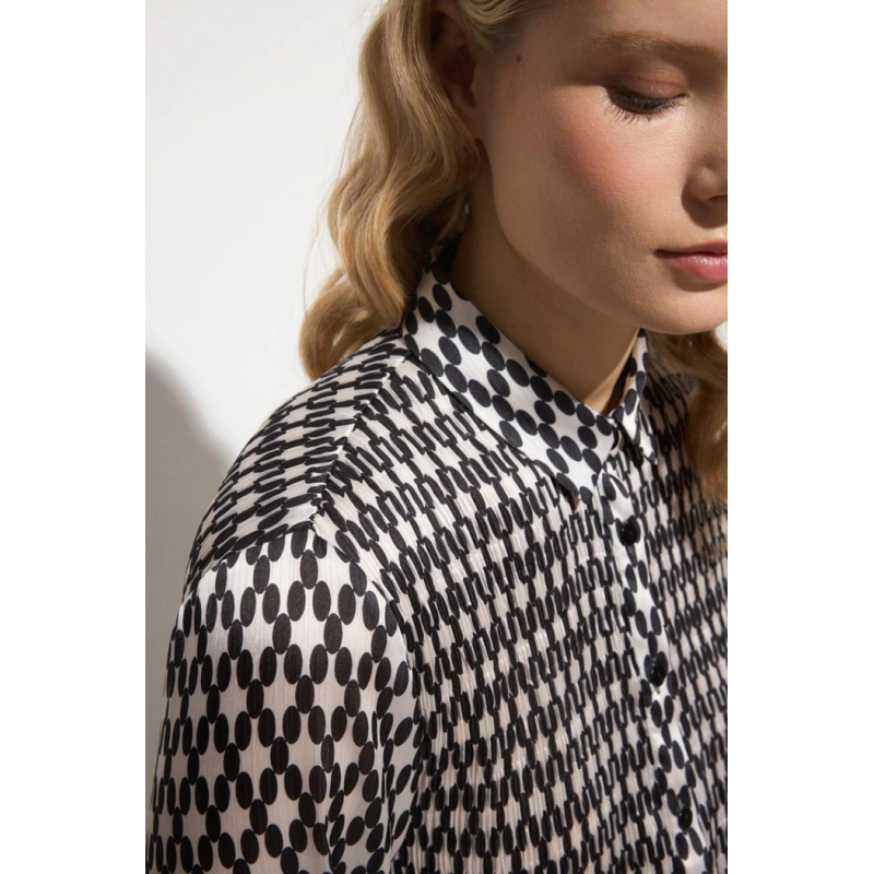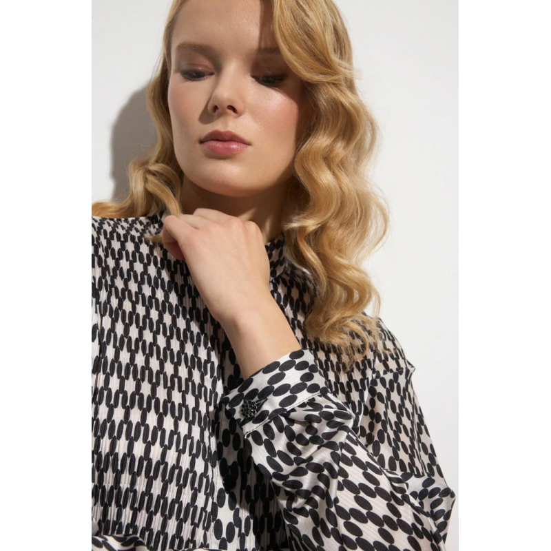 Camisa para mujer plisada con estampado paisley. Cuello camisero. Manga larga y puño con cierre de botón metálico. Cierre frontal con botones efecto nácar al tono. Bajo recto.