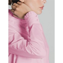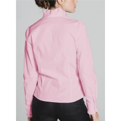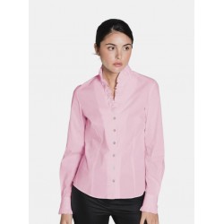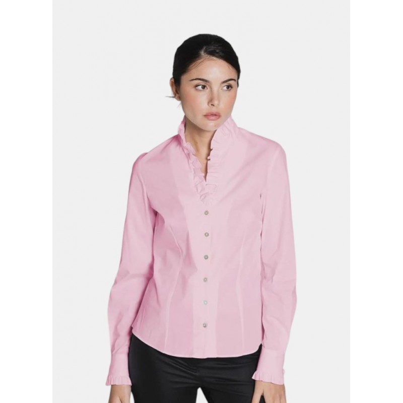 Camisa para mujer de cuello abierto de doble volante fruncido y escote en V, cierre frontal de botones y manga larga de puños con doble botón y remate de volante fruncido.