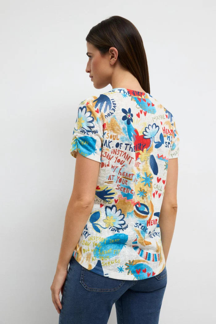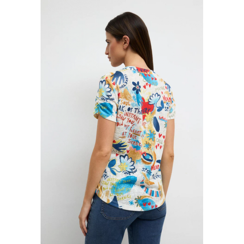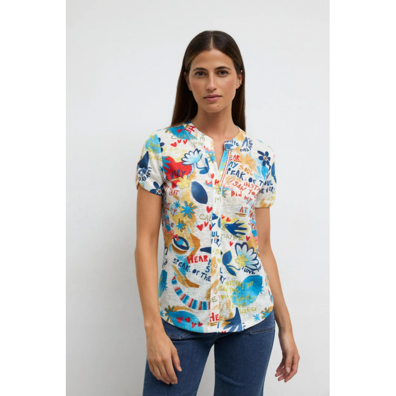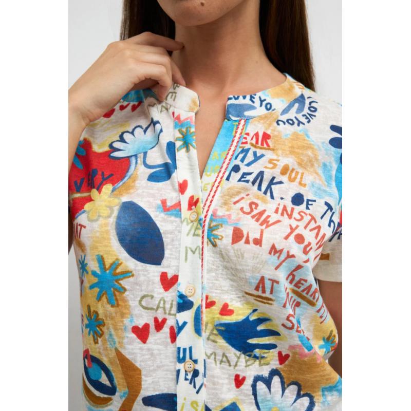 Camisa estampada para mujer. Cuello mao. Estampado artístico con mensajes y motivos abstractos. Escote en V. Cierre frontal con botones. Bajo redondeado.