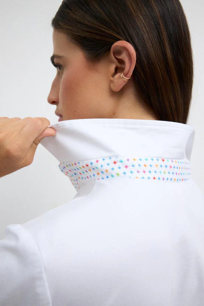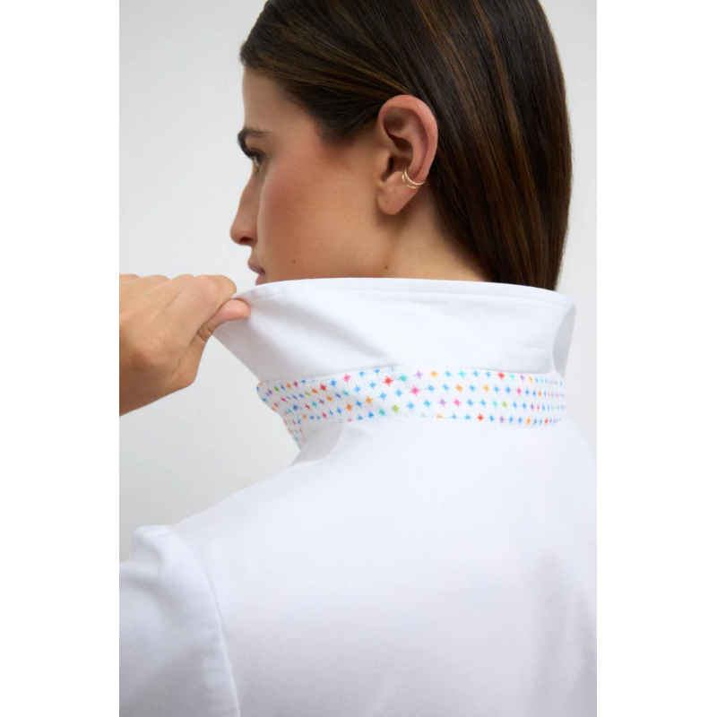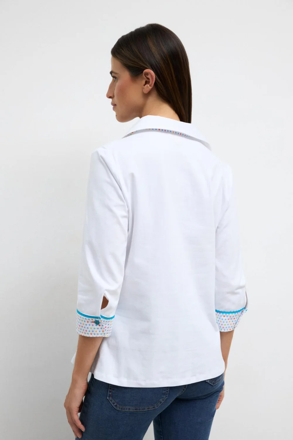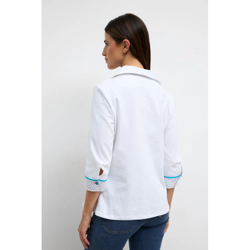 Camisa de mangas tres cuartos para mujer. Cuello camisero. Detalles de interior de puños y cuello en estampado de estrellas a contraste. Escote en pico. Cierre frontal de botones y bajo recto.