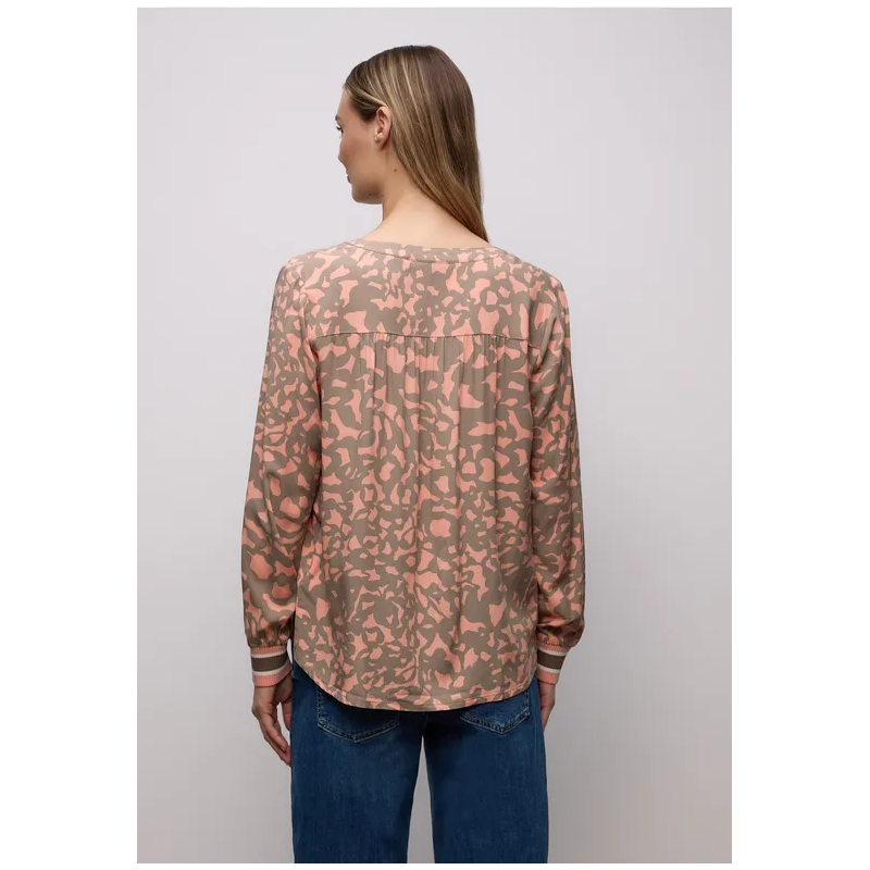 Camisa estampada para mujer. El cuello abierto y los detalles de rayas en los puños le dan un aspecto moderno. Su tejido vaporoso de viscosa la convierte en la compañera perfecta para looks elegantes y cómodos.