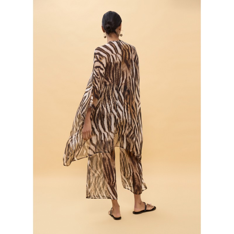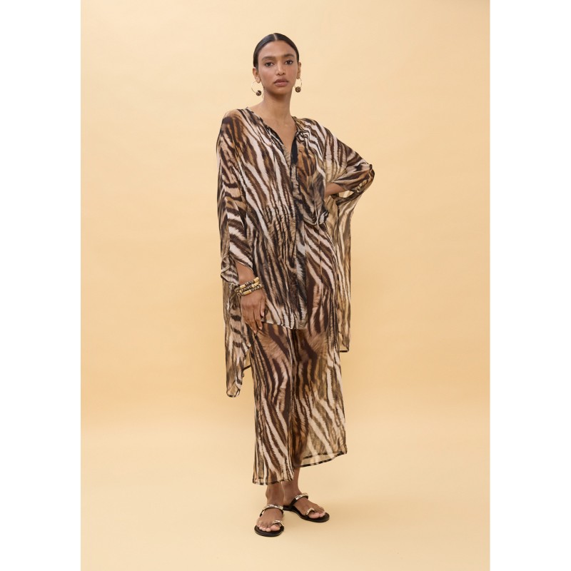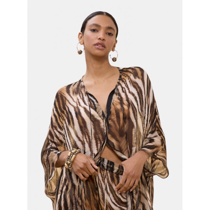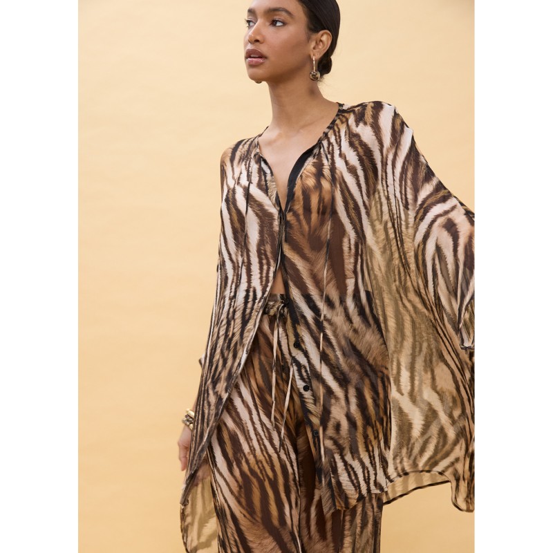 Camisa suelta con un impactante estampado de zebra. Diseño ligero y vaporoso, perfecta para un look atrevido. Presenta cuello en V y mangas amplias, ideal para combinar con pantalones o faldas ajustadas. Detalle de botones al frente.