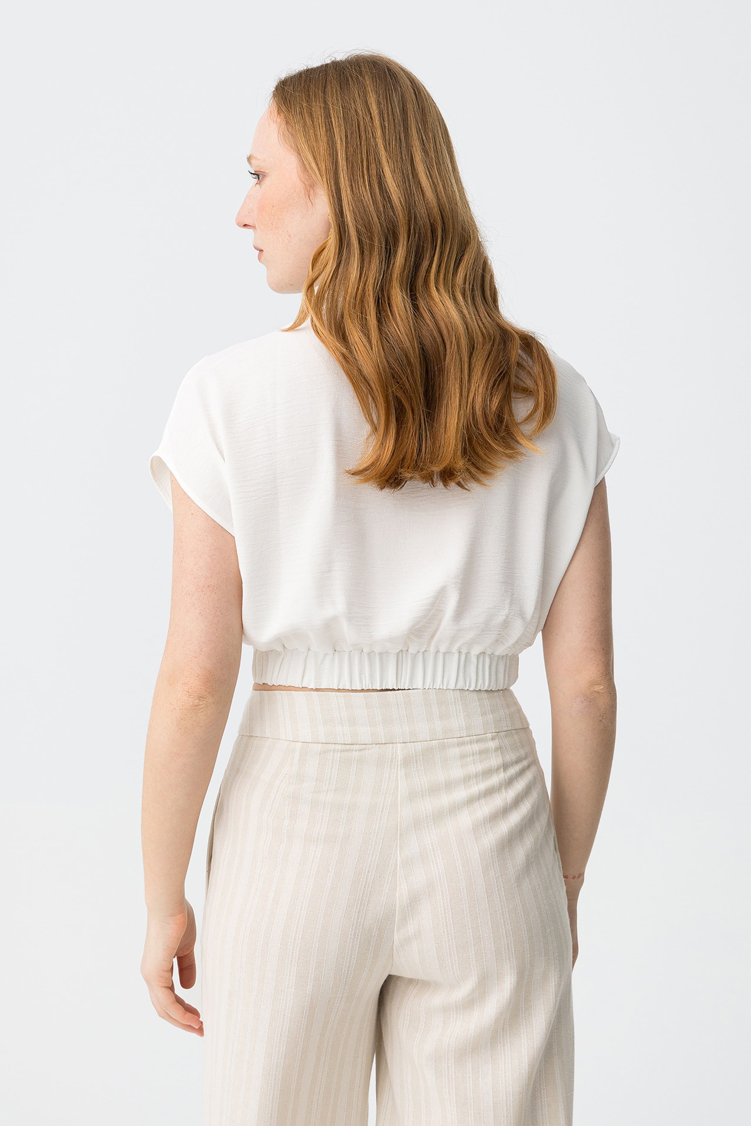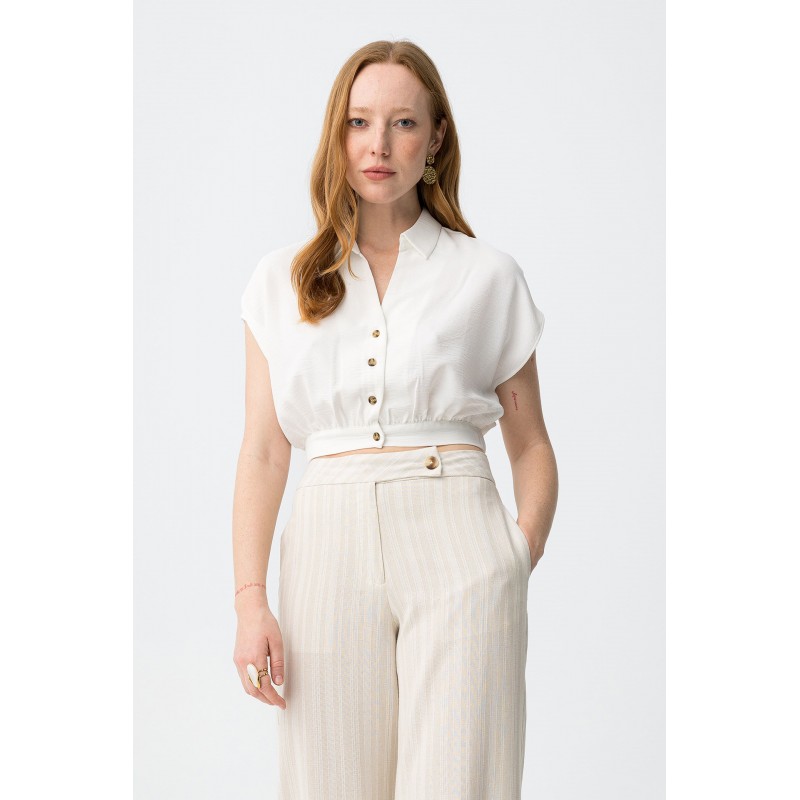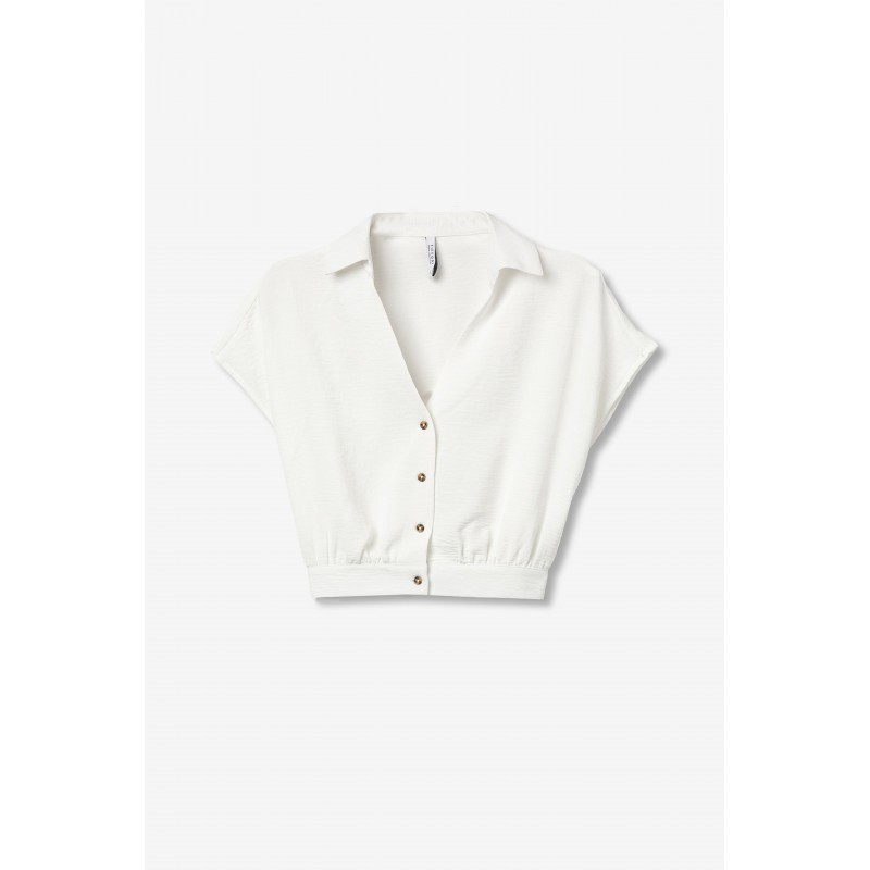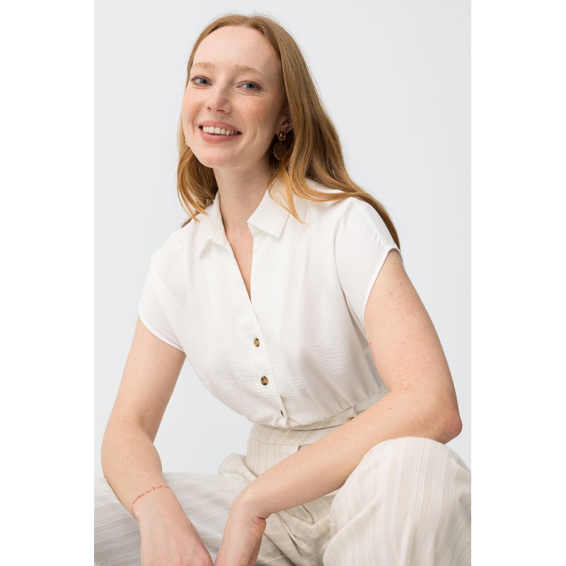 Camisa de manga corta, corte relaxed, botones delanteros y cintura elástica, en tono crudo suave.