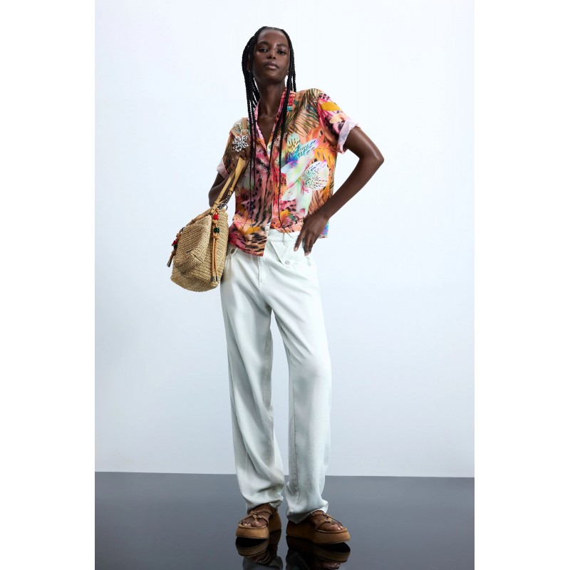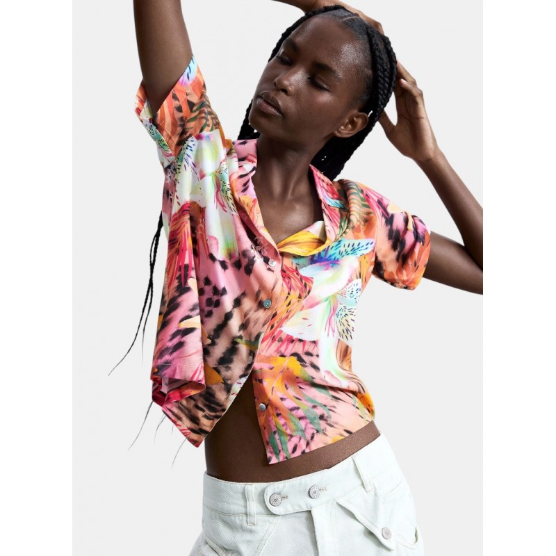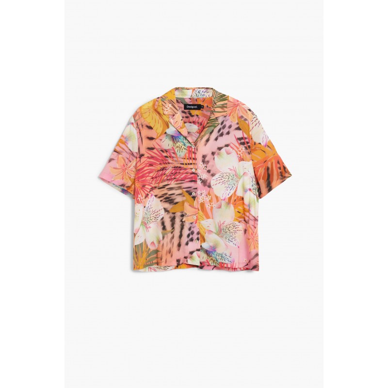Camisa de corte regular, con manga corta, escote en V y estampado de inspiración tropical.
