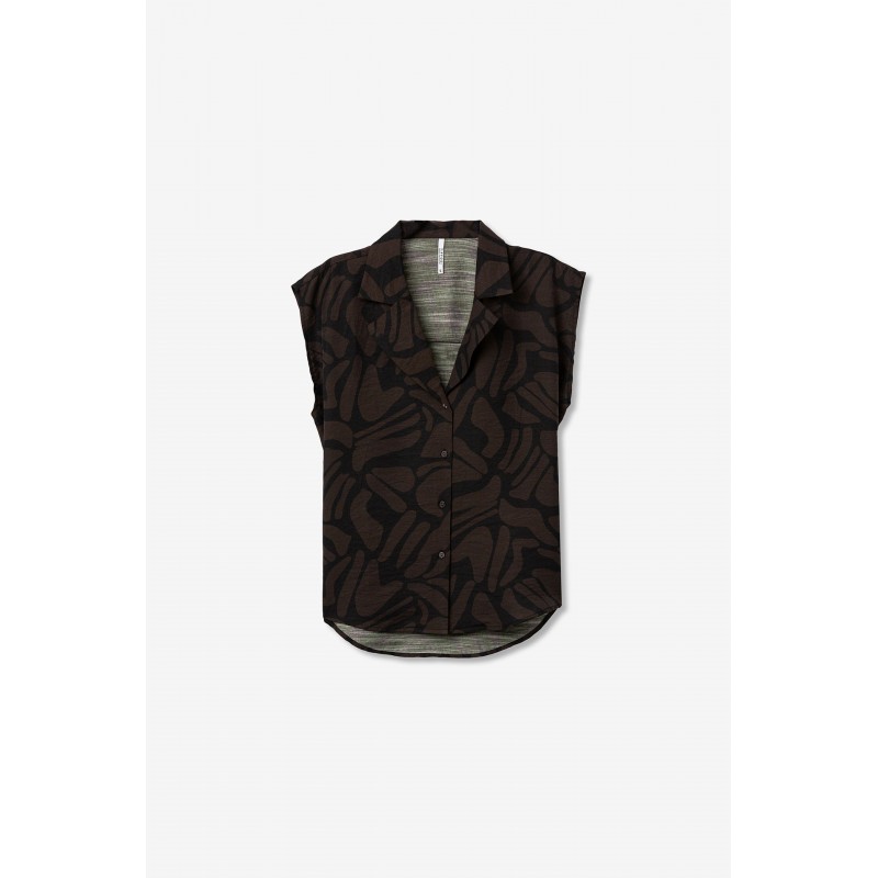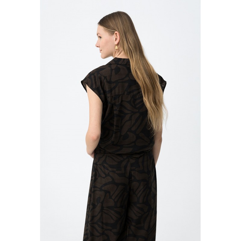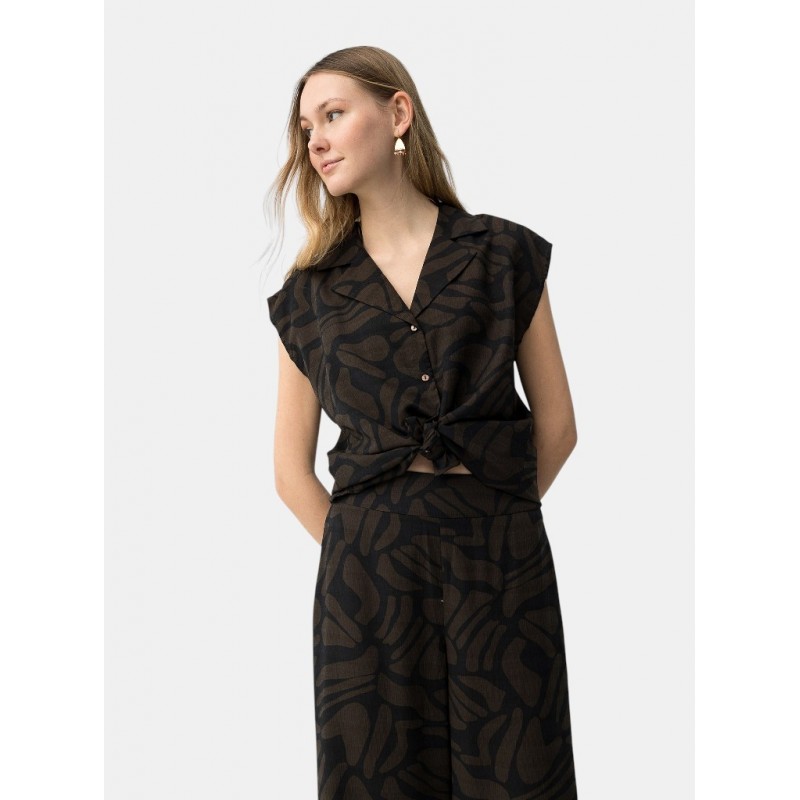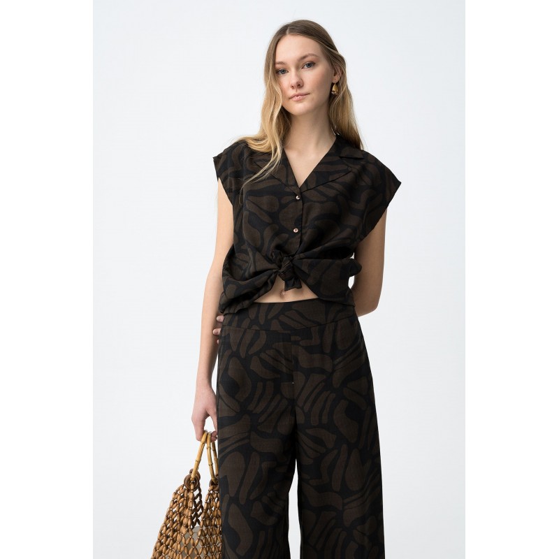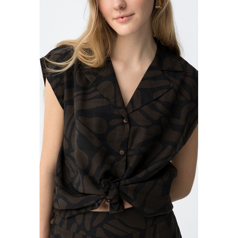 Camisa manga corta de color negro con estampado abstracto, corte amplio y nudo frontal moderno