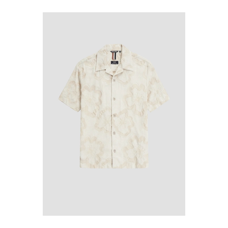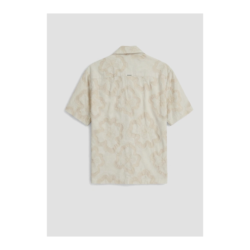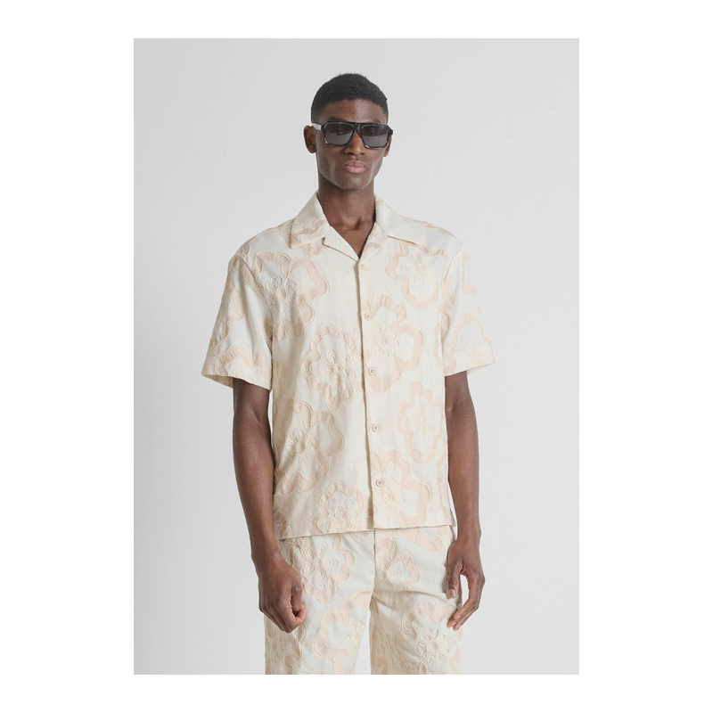 Camisa de estampado bordado floral, cierre de botones, cuello camisero y manga corta.