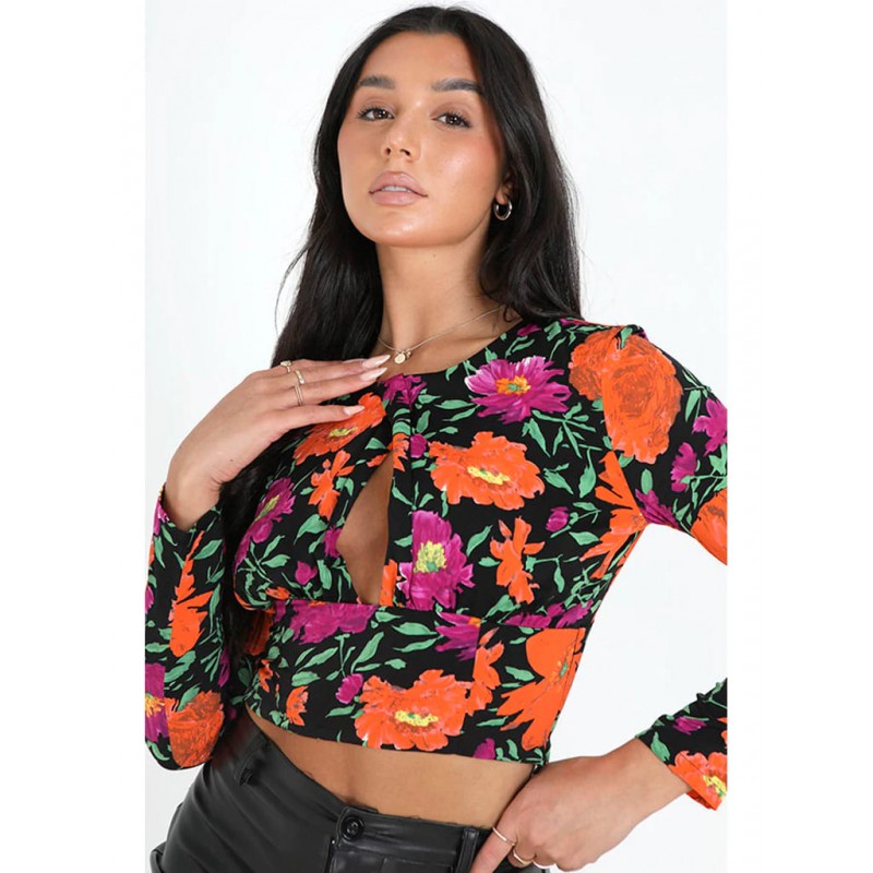 Blusa cropped para mujer de estampado de flores, cuello redondo con escote lágrima y de manga larga.