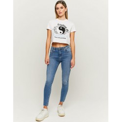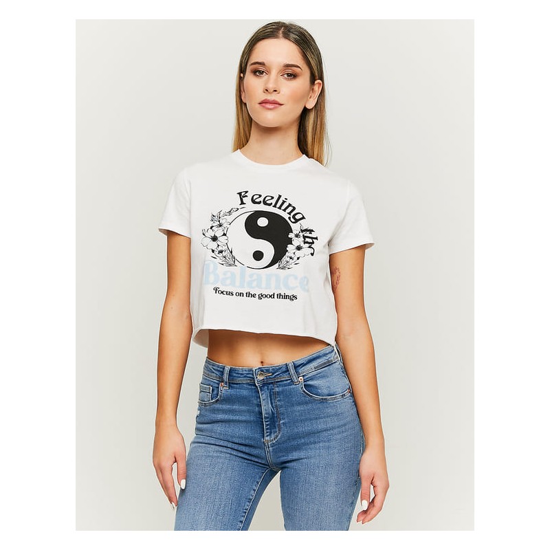 Camiseta crop manga corta y cuello redondo con serigrafía en el pecho.