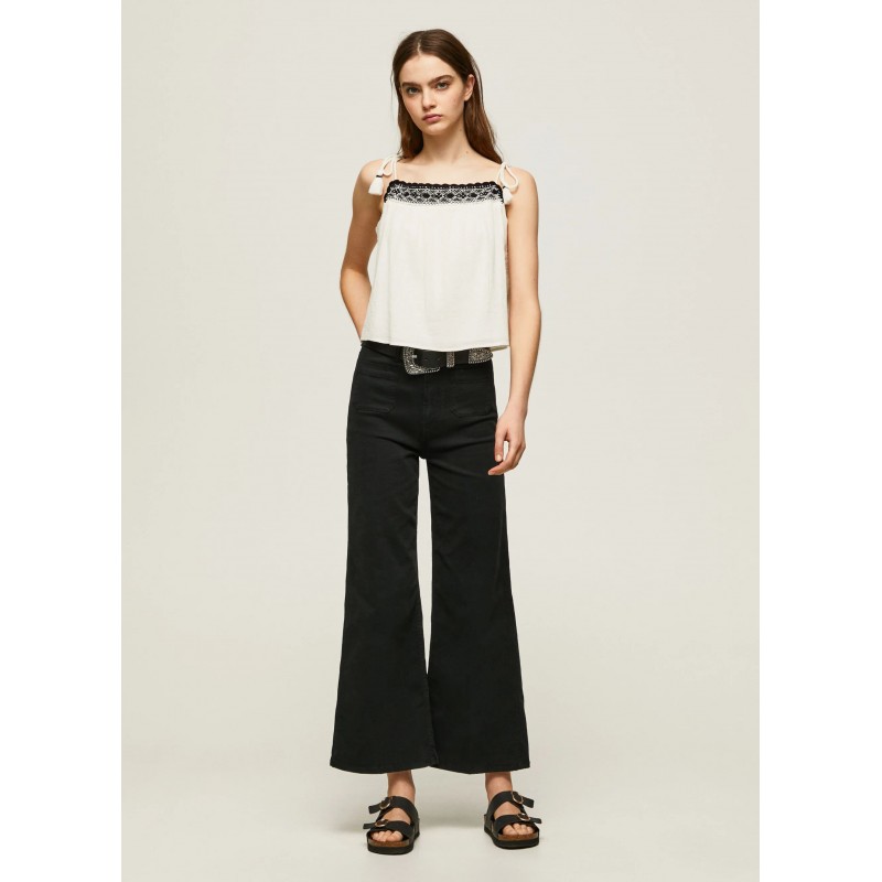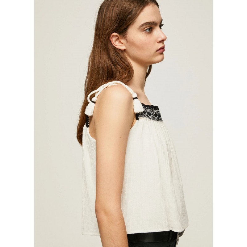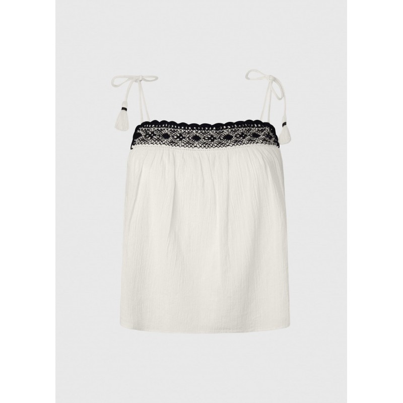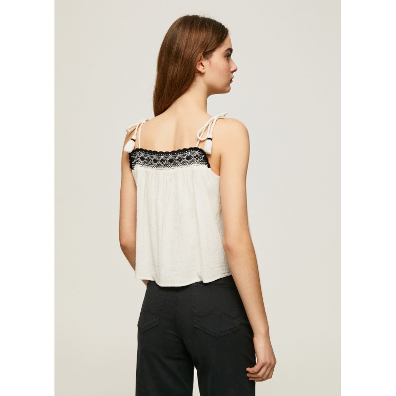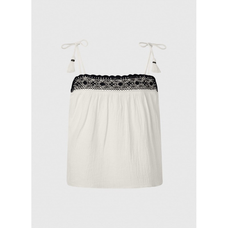Top fit cropped de tirantes ajustables con detalles de borlas. Escote recto con detalles de crochet en contraste. Cinta escalera debajo del pecho.