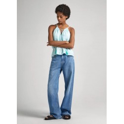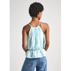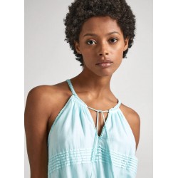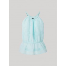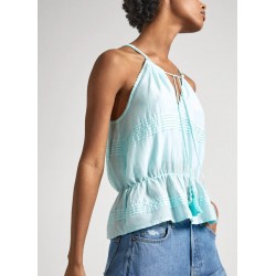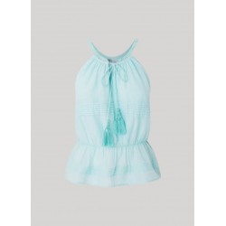Top para mujer en tejido voile de algodón, escote en V con copas triangulares, tirantes en macramé, cordón de borlas decorativas en su cintura elástica, detalles plisados y volantes en el bajo.