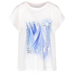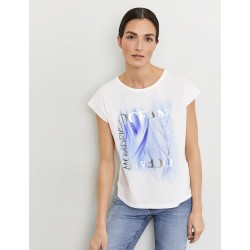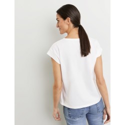 Camiseta para mujer estampada con detalle de strass en la parte frontal, escote redondo y manga corta caída.