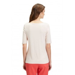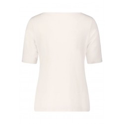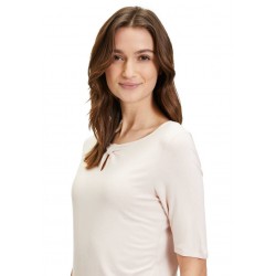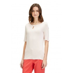 Camiseta para mujer de material fino, cuello redondo con abertura en forma de lágrima y manga corta.