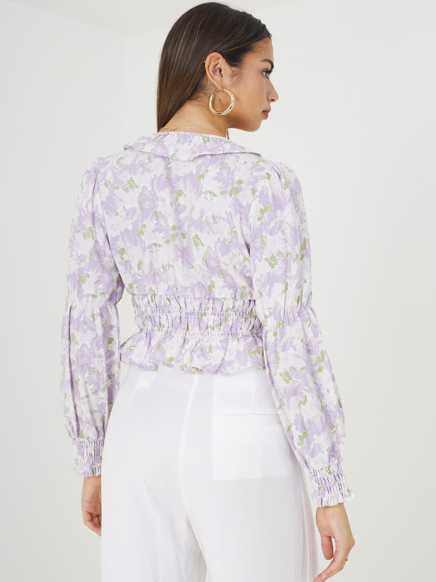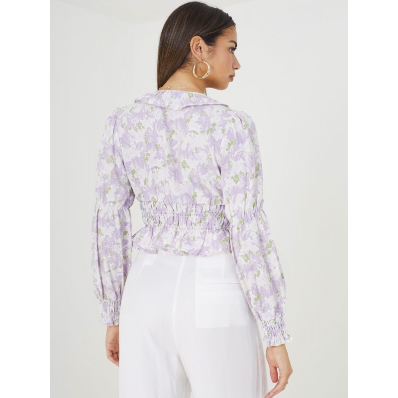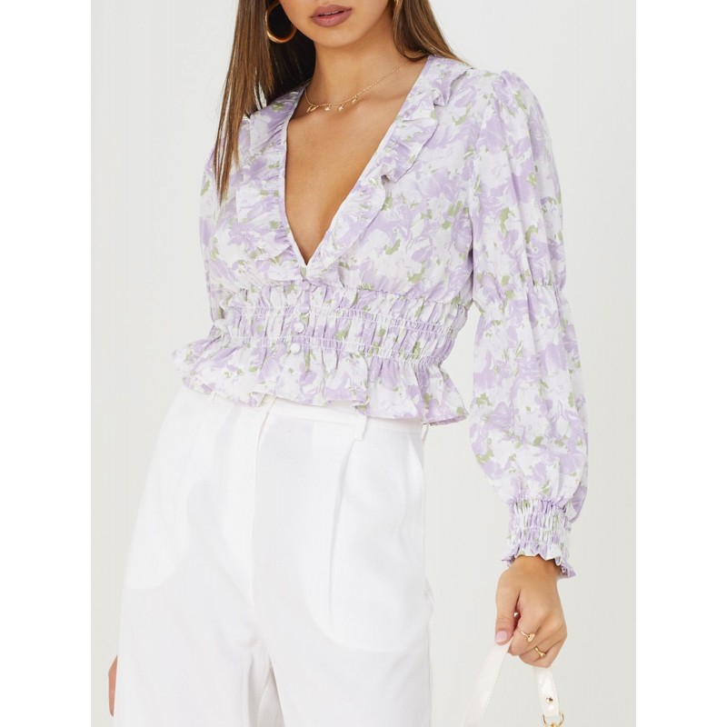 Top estampado para mujer. Largo recortado con cintura fruncida. Detalle de botones. Manga larga con ribete de volantes en puños y escote.