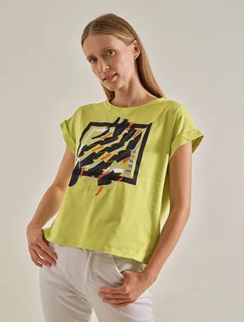 Camiseta de algodón con cuello redondo y mangas cortas. Patrón especial de colores en el pecho. hecho en España.