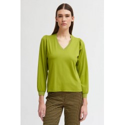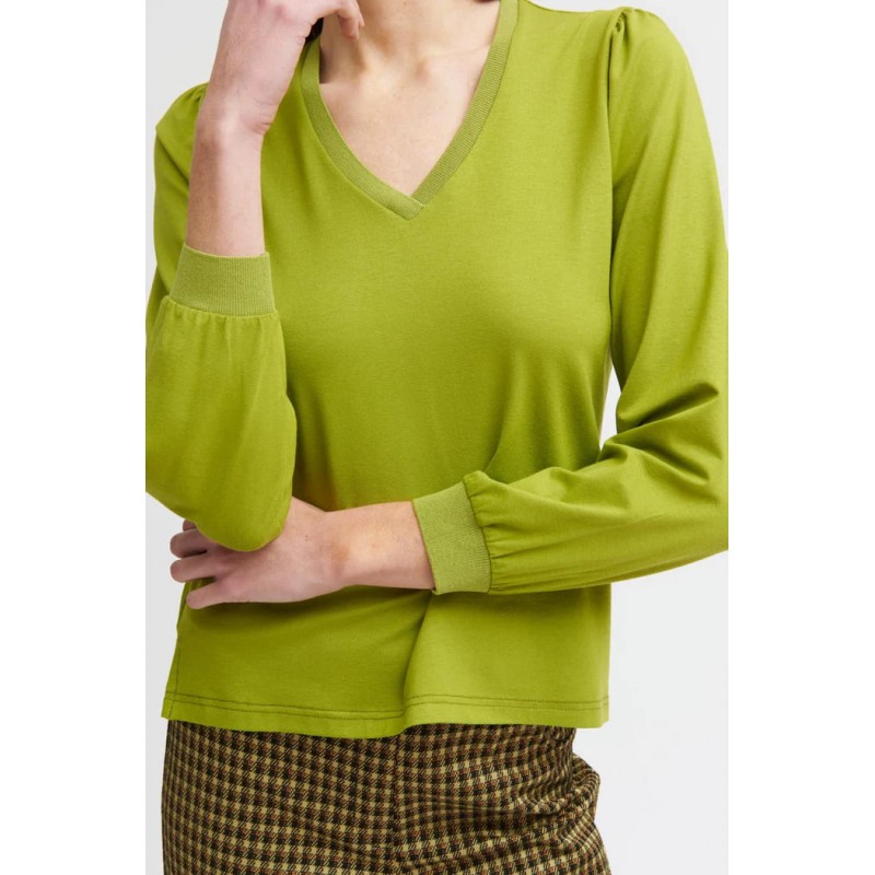 Camiseta lisa para mujer. Escote en V con detalle en punto. Diseño entallado. Manga larga ligeramente abullonada con puños en punto. Bajo recto.