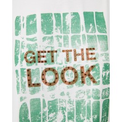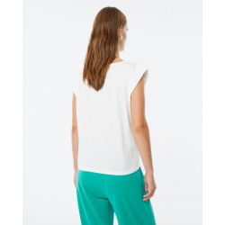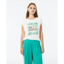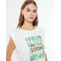 Camiseta estampada para mujer de cuello redondo, adornos con piedras de strass repartidas encima de las letras de la parte delantera y de manga corta caída.