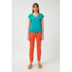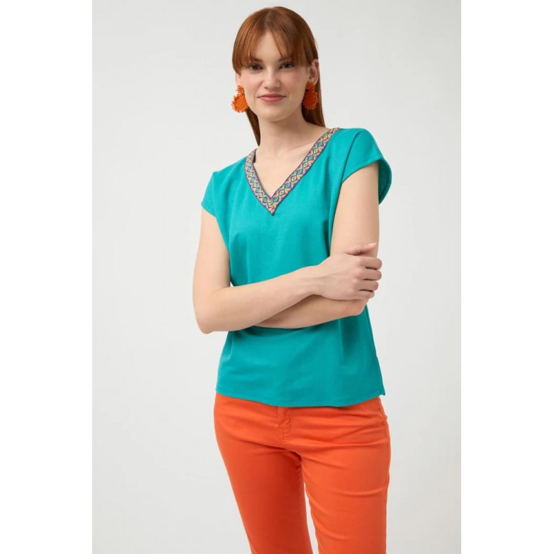 Camiseta para mujer de escote en V con detalle de ribete estampado, aberturas laterales en la parte baja y manga corta.