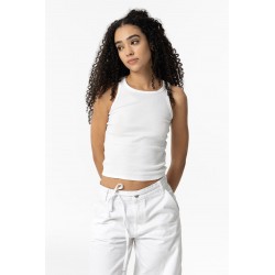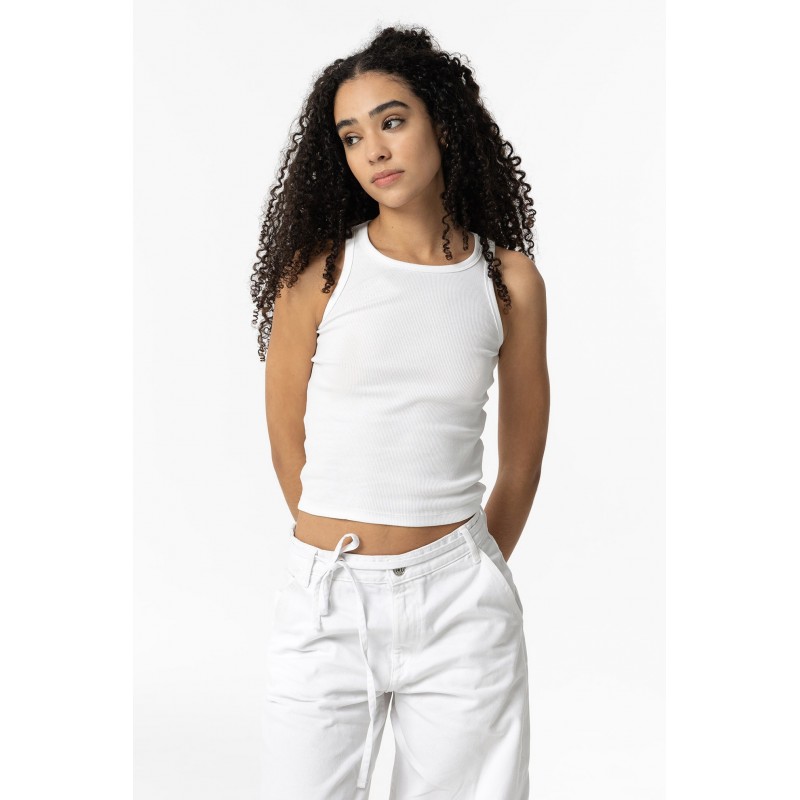 Top liso cropped para mujer. Con cuello redondo y manga sisa, confeccionado en algodón.